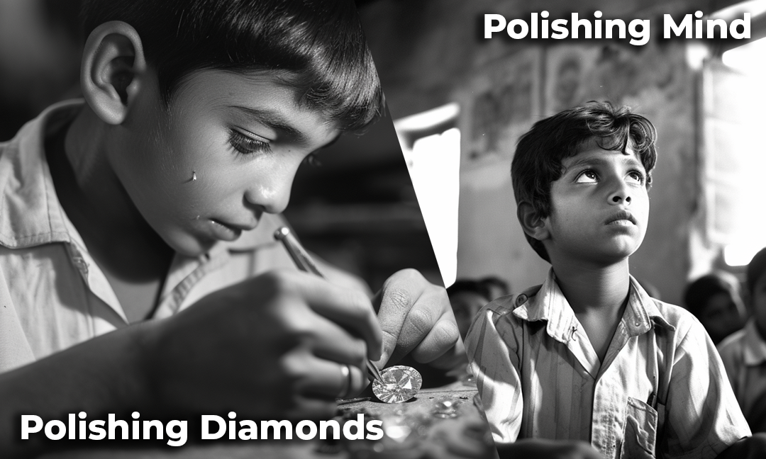 in 1987, our 2nd Generation Sir. Bharat did half time school and worked half time as a Diamond laborer polishing Diamonds with salary of 7$ per month to provide for the family.