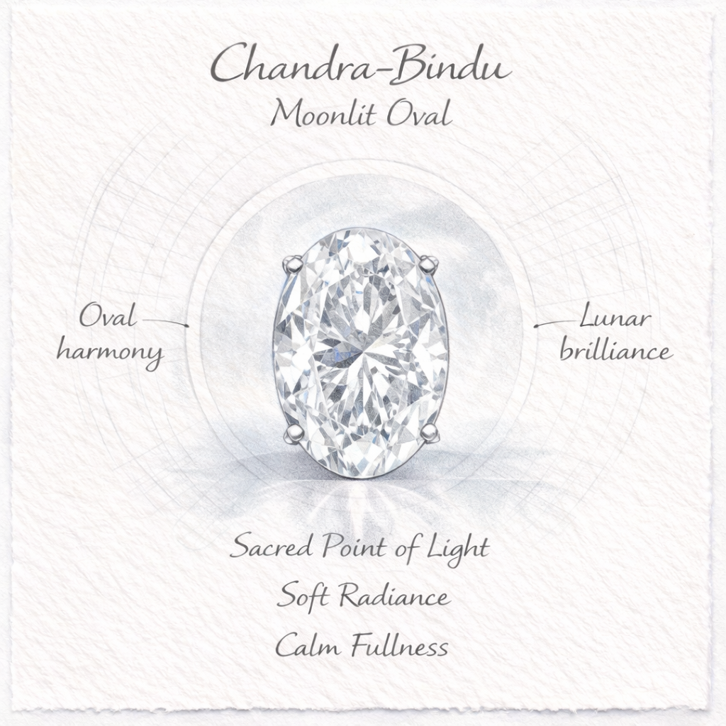 Each oval diamond is conceived as Chandra-Bindu (चन्द्र-बिन्दु), inspired by the calm fullness of the moon and the softened purity of a sacred point of light.